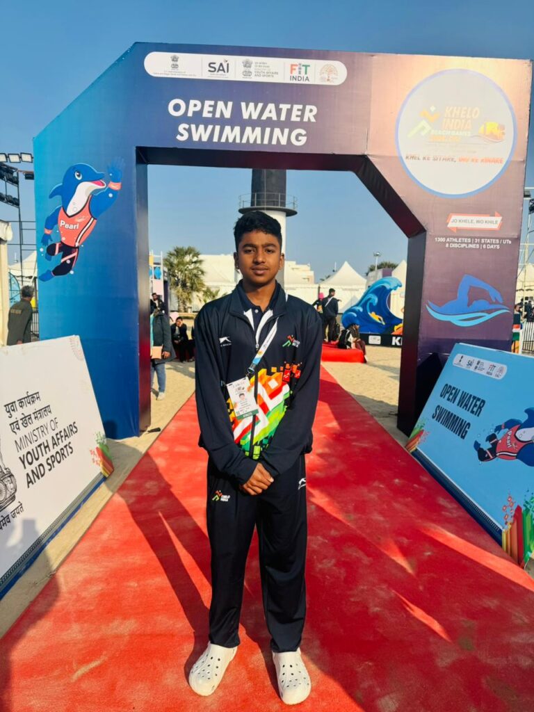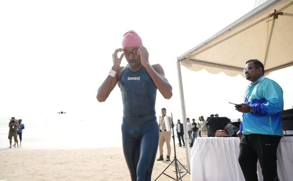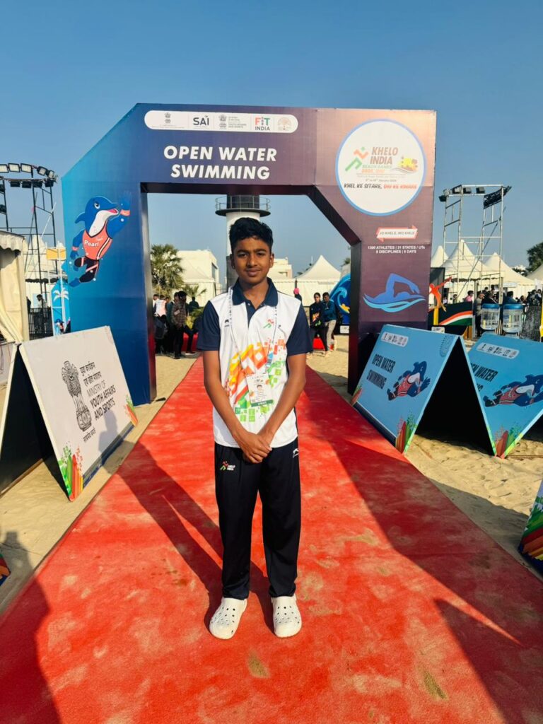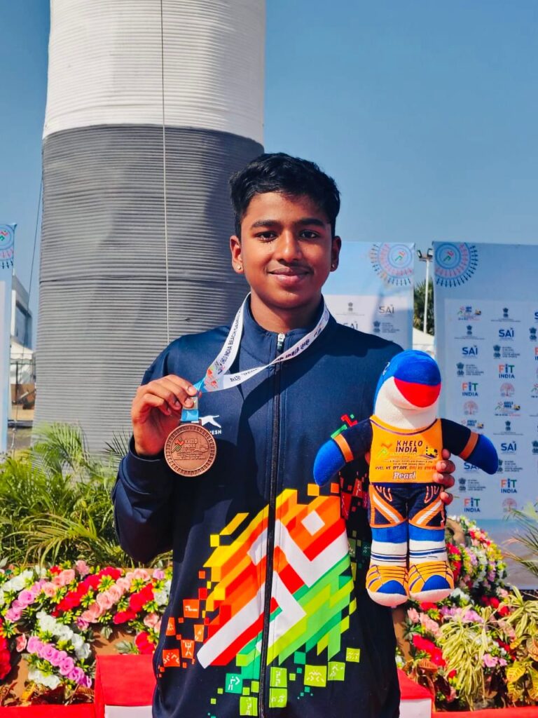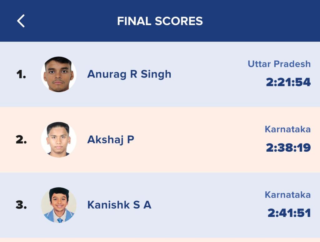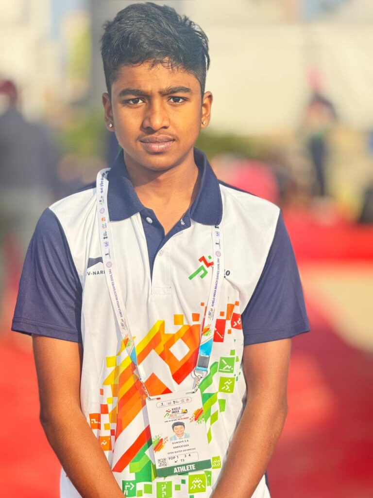 Kanishk SA, from Karnataka, participated in 10 km open water swimming competition and finished with the timings of 2:41:51 (2 hours 41 minutes 51 seconds) and won bronze medal
