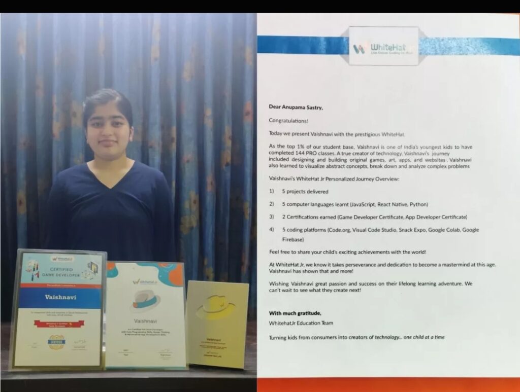 Vaishnavi Somayaji Sastry of 10 A (2021-22) is a certified Full stack developer, AI coder and Game developer, having learnt coding in JavaScript, HTML, CSS, Python, React- Native from Whitehat Junior from the past two and half years. Looking forward to few more sessions to complete Virtual Reality.